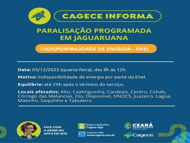 A Companhia de Água e Esgoto do Ceará (Cagece) informa paralisação programada no sistema produtor do abastecimento de água em Jaguaruana nesta quarta-feira (03/12) por conta de indisponibilidade de energia pela ENEL.